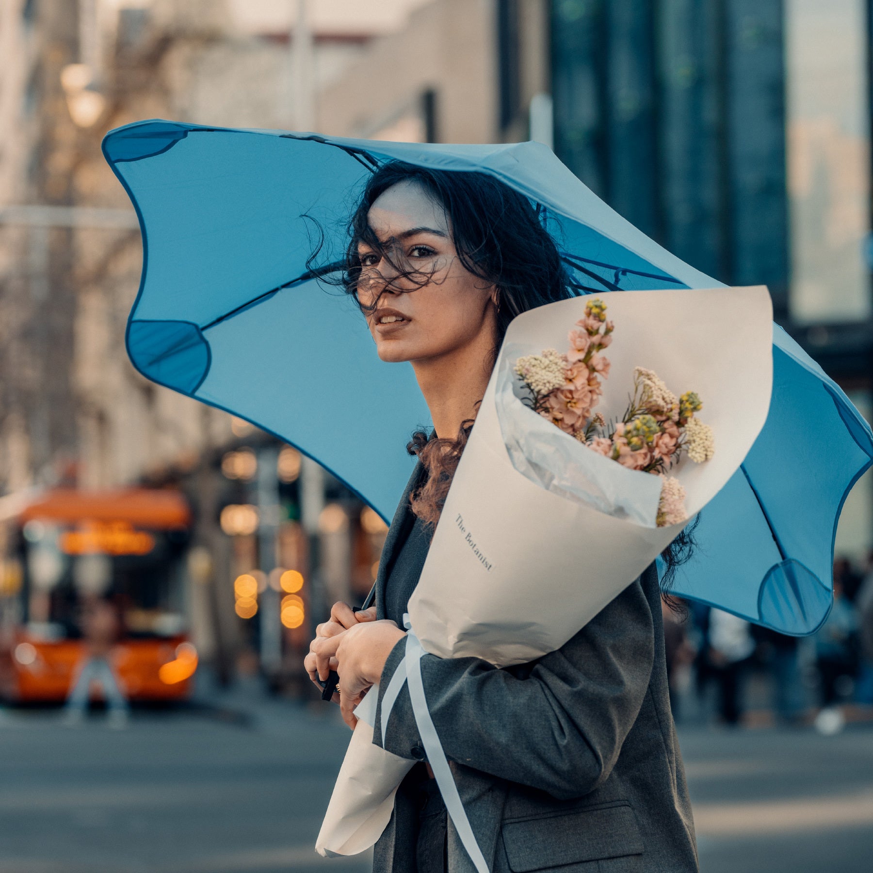 ニュージーランドで開発された傘ブランド、BLUNT Umbrellaオートオープン(プッシュボタンで開き、手動で閉じるタイプです)メトロは360度回転するユニークなテクノロジーを採用し、狭い場所での衝撃にもエレガントに対応します。