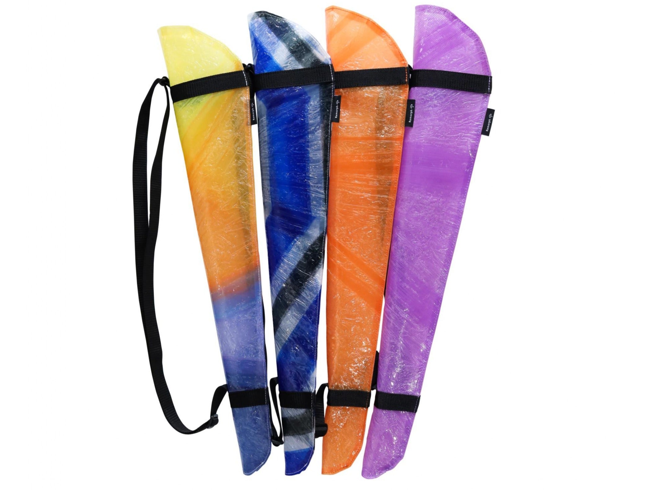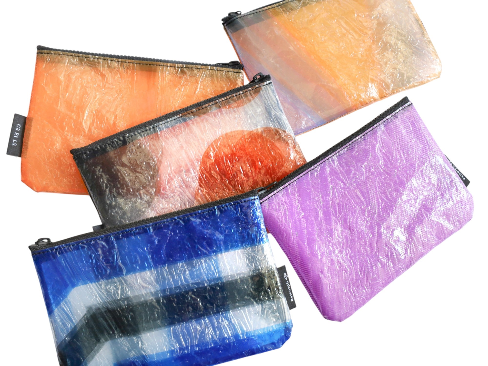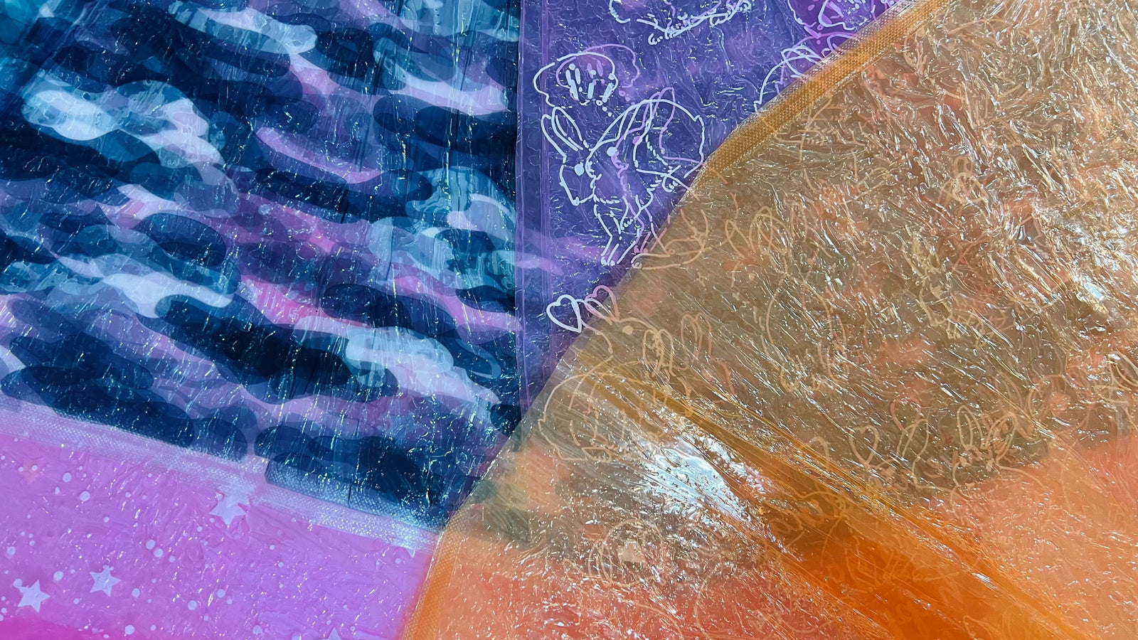 複数の傘生地を重ね、熱と圧力をかけて一枚の新しい生地へと再生する過程で、異なる色や柄が混ざり合い、予期せぬ模様が生まれます。同じ製品を作ろうとしても、二度と同じ表情には出会えません。